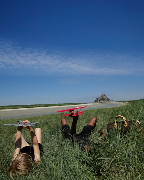 Against the monumental backdrop of France’s Mont Saint-Michel, a group of local children frolic on the tidal island’s shoreline, embodying a limitless sense of optimism and freedom.