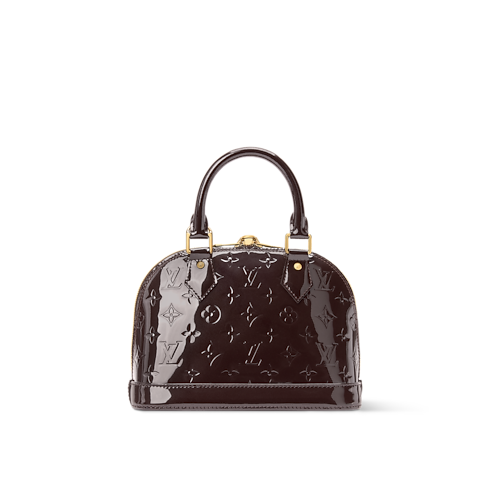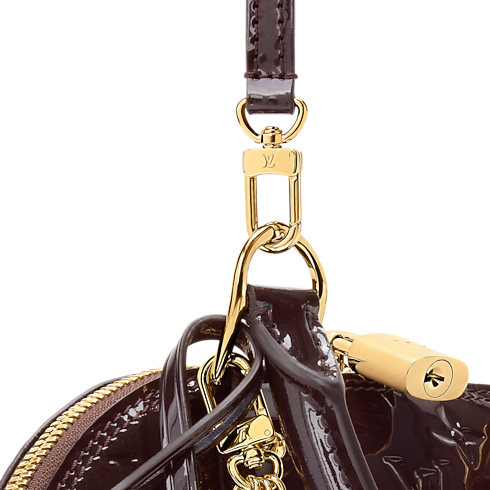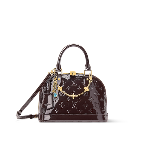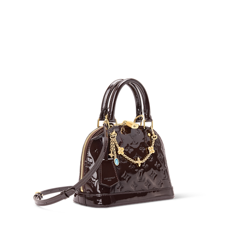 The LV Mirage collection presents this Exceptionals edition of the Alma BB, reimagined in varnished cowhide leather that is patterned with the House's Monogram. It is accented with multiple LV signatures, including a keybell and padlock, as well as a removable LV flower-embellished chain. Offered in a chic Datewood palette, the elegant style can be worn with or without the longer strap.