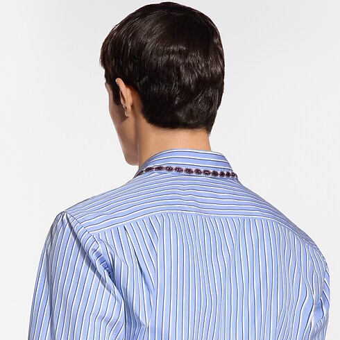 This long-sleeved shirt draws on the Spring-Summer 2026 show’s Indian Dandy inspiration. It is crafted from organic cotton with a heritage striped jacquard in fresh blue tones. Meticulously embroidered beads on the collar and the cuffs create a jewel-like effect. Perfect for layering, this piece brings a sophisticated accent to an ensemble.