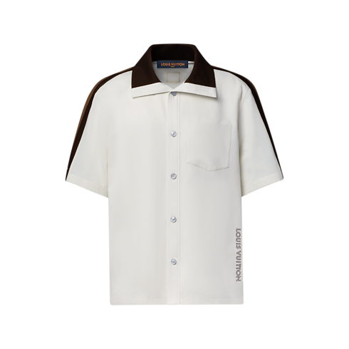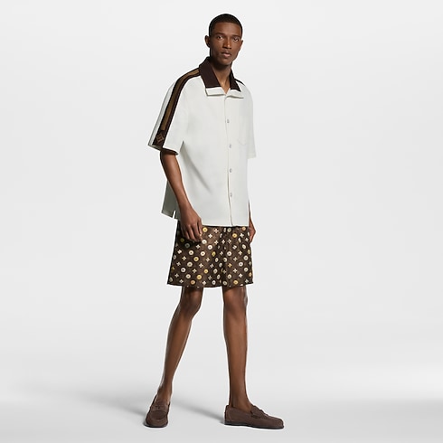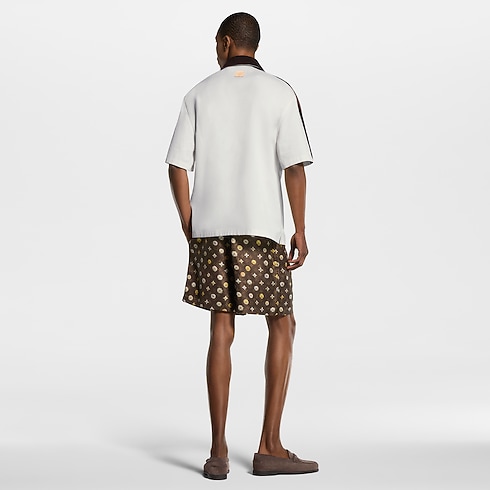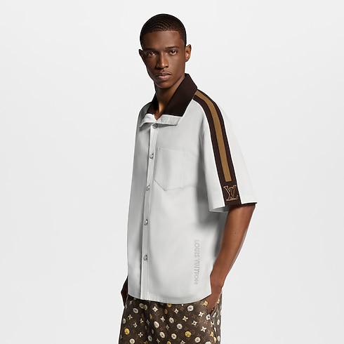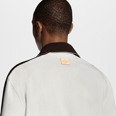 Dark brown ribbed inserts lend a graphic accent to this short-sleeved white cotton piqué shirt. Signature-embroidered bands adorn the shoulders and sleeves, while the brown collar can be buttoned up like a turtle neck or worn open. Embroidered Louis Vuitton lettering on the left torso adds a sporty touch. Mix and match with this collection’s flowing pants and shorts for a preppy look.