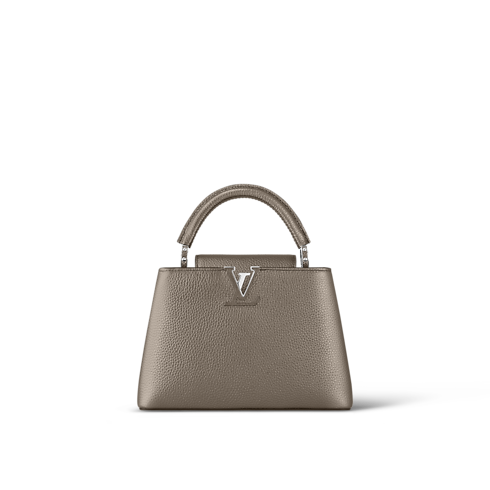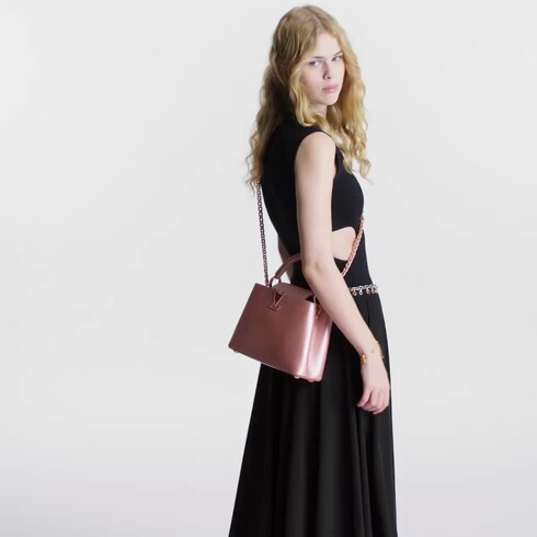 This charming Capucines BB handbag is fashioned from pearly-pink Taurillon leather with hardware in a rose-gold hue. The Taurillon leather has been specially treated with a metallic pigment to give the bag a subtly shimmering aspect. There’s a top handle and a removable chain, braided with the same iridescent leather, for shoulder and cross-body carry.