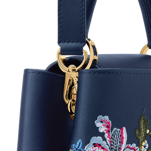 This elegant Capucines BB is defined by the vibrant flora and fauna-print that beautifully offsets the Marine Blue palette. It is crafted from calfskin and trimmed with a cowhide handle and strap, offering multiple styling options. The double-carry style is adorned with signature LV Initials and is fitted with a flat pocket inside the compartmented interior. It is sized to fit everyday items, including a phone, wallet and some makeup essentials.