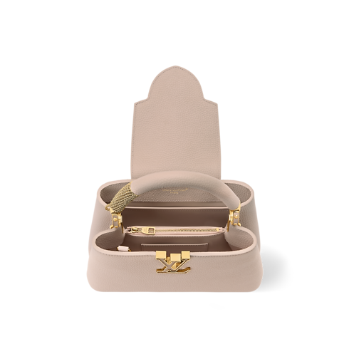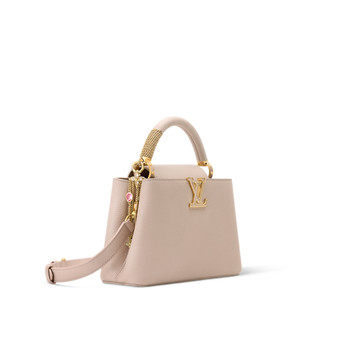 The LV Mirage collection presents this seasonal edition of the Capucines BB, crafted from Taurillon leather in a sophisticated Desert Sand palette. The double-carry style is embellished with tonal LV Initials and a decorative stone-embellished charm, which matches the gold-toned detail on the handle. Inside, it is fitted with several pockets and can be worn multiple ways.