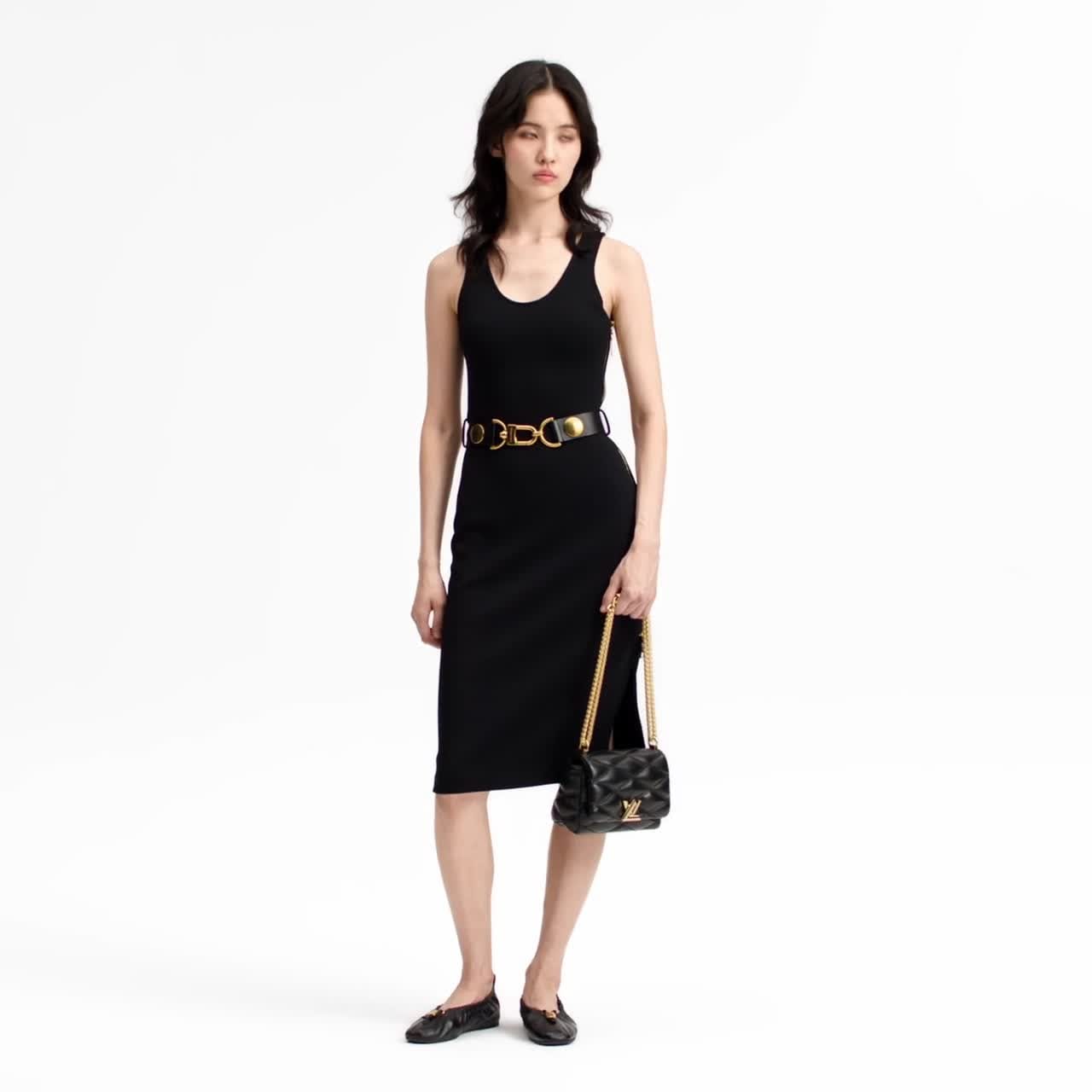Statement detailing elevates this understated dress with edge. It is cut from a lightweight viscose-blend crepe jersey in a sleek tank silhouette that falls to the knee. The waistline is highlighted with a chunky leather belt detailed with golden studs and an oversized carabiner clip for a modern twist.
