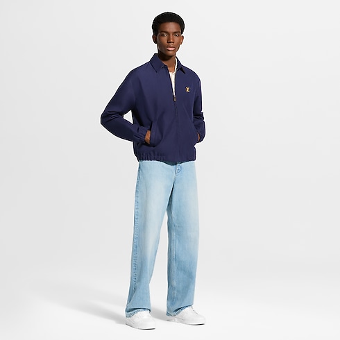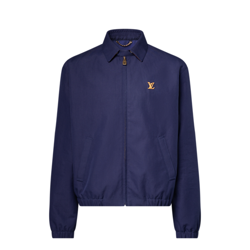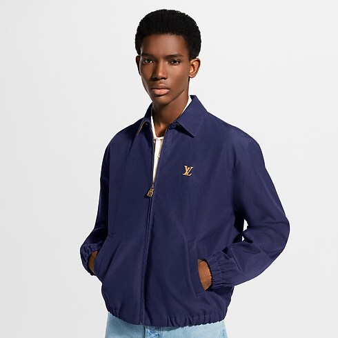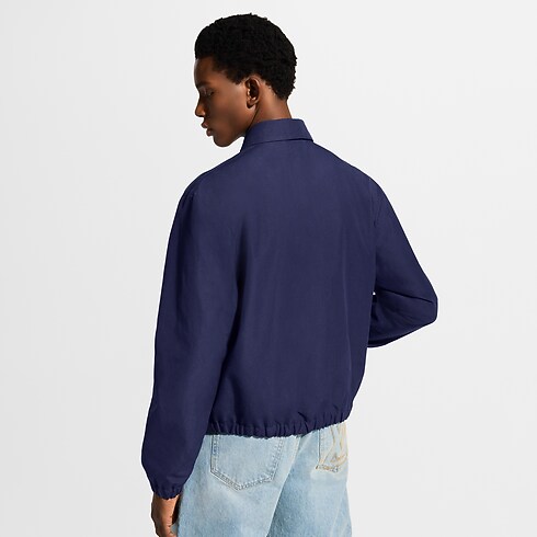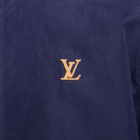 The timeless silhouette of this dark blue coach jacket is crafted from a blend of cotton, wool and silk. A VVN leather-inspired LV patch adorns the chest in homage to the House’s leather goods heritage. Mini Monogram-embossed suede leather accents the underside of the collar, while a Monogram motif embellishes the lining. Matching shorts make a smart set.