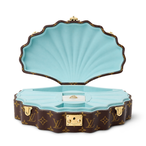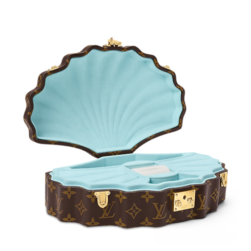 The hidden pearl of the hard-sided collection, the Coffret Coquillage takes its shell-like form from motifs in Anne of Austria’s Louvre apartments. Fashioned from Monogram canvas, it features a central cushion for watches and bracelets and a dedicated ring slot, side cushions for rings and earrings, and a scalloped interior created through 3D printing, lined in lagoon-blue microfiber.
