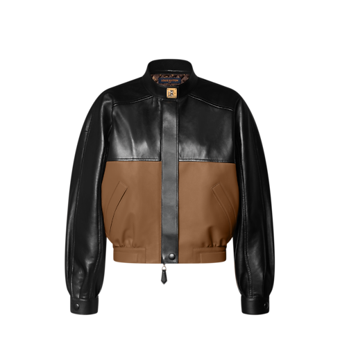 This classic bomber jacket is reimagined in leather for a sophisticated modern look. The slick look of black lambskin is offset by a color-blocked lower half for a graphic contrast. A swing lock adds an emblematic metallic accent to the standing collar, while a quilted Monogram lining signs the inside. Complete with two side pockets.