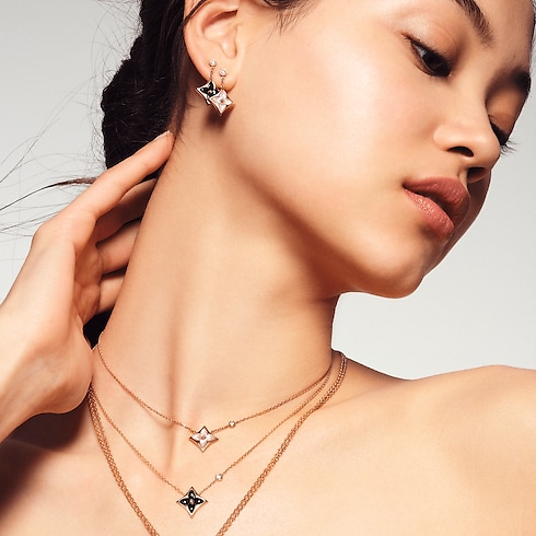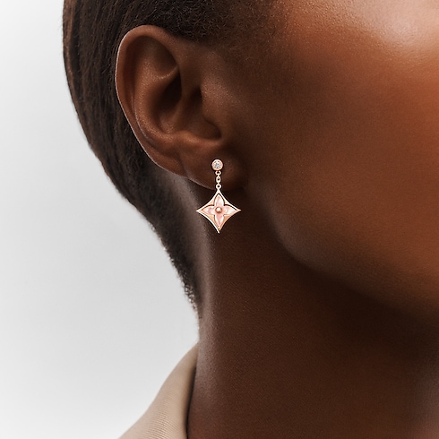 The Color Blossom pieces celebrate the emblematic Monogram Flower, designed in 1896 by Georges-Louis Vuitton, son of the founder. Set into 18-karat pink gold, these precious earrings feature Star motifs carved from pink mother-of-pearl, hand-polished to a high gloss and accented by brilliant round diamonds. Months of work were necessary to perfect the stones’ subtle curves and sparkle. These delicate earrings are an invitation to stack, mix or match with other models from the collection.