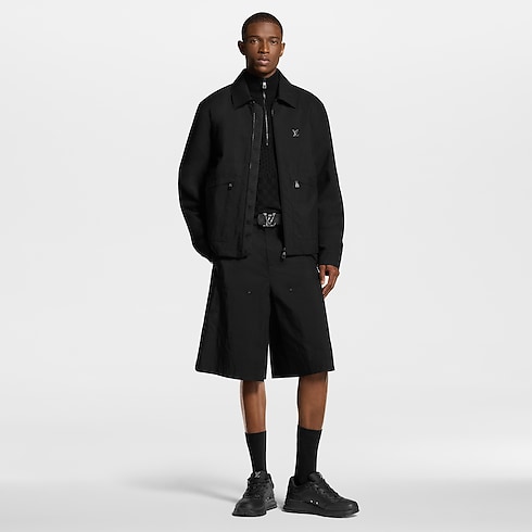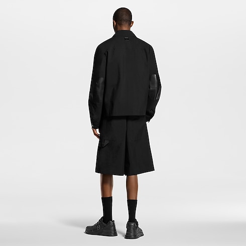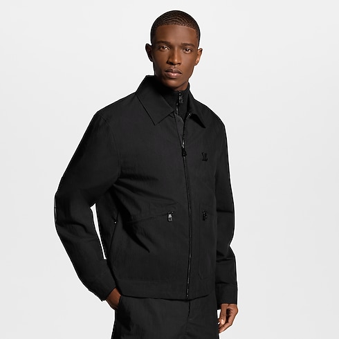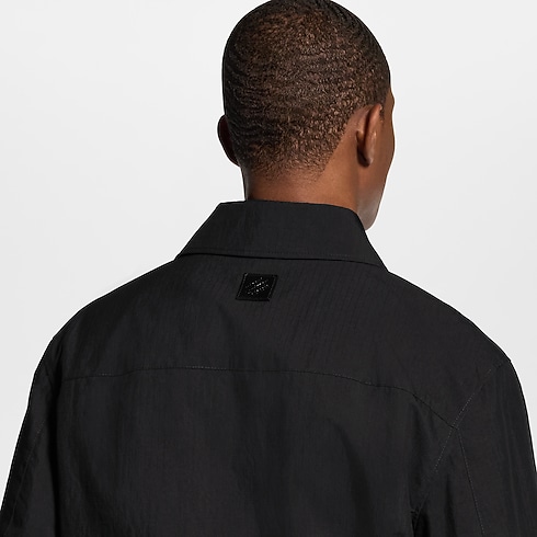 This black utilitarian jacket with a smart shirt-style collar is a light midseason layer. Crafted from technical cotton ripstop, it is elevated with discreet tone-on-tone signatures, including a metal LV ornament on the chest, a leather signature patch on the back and Monogram lining. It can be styled with other black pieces from this collection for a technical look.