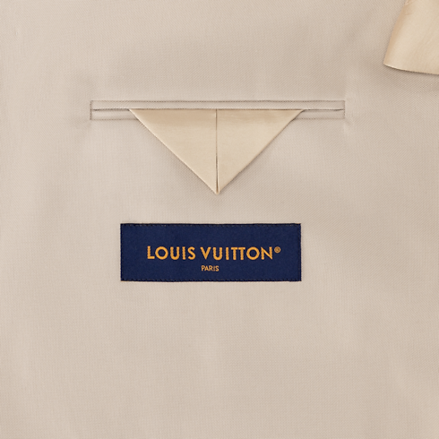This minimalist beige workwear jacket makes an elegant modern addition to the formal wardrobe. It is tailored from a smooth cotton-silk canvas that is light and breathable for summer. A tone-on-tone triangular leather patch adorns the left chest, crafted with a Damier motif and embellished with a metal LV ornament. Matching pants make an effortless set.