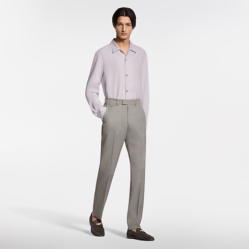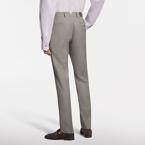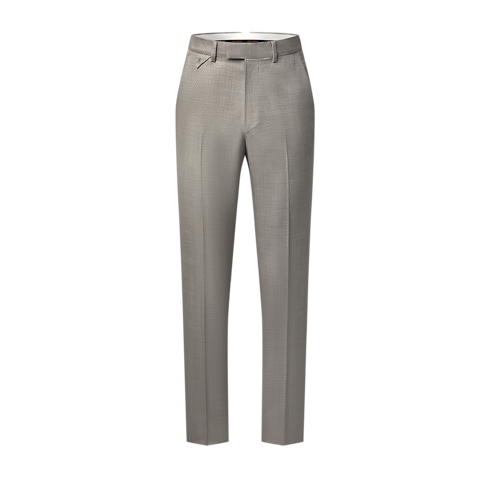 These pale beige cigarette pants are tailored from fine virgin wool featuring a delicate tone-on-tone jacquard Micro Flower Damier motif and signed with a woven LV label on the back. Their slender silhouette can be paired with a matching Napolitana jacket to create an elegant modern suit for business occasions, elegant summer evenings, or weddings.