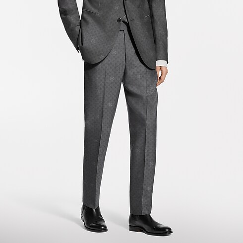 Elegantly tailored in a timeless dark gray, these flattering cigarette pants are ideal for formal business occasions. The fine wool is woven into a tone-on-tone jacquard with a sophisticated Mini Damier Seeds motif. The pattern incorporates Monogram Flowers with a softly dappled effect, while a woven LV label signs the rear waist. A matching jacket makes a poised and streamlined suit.