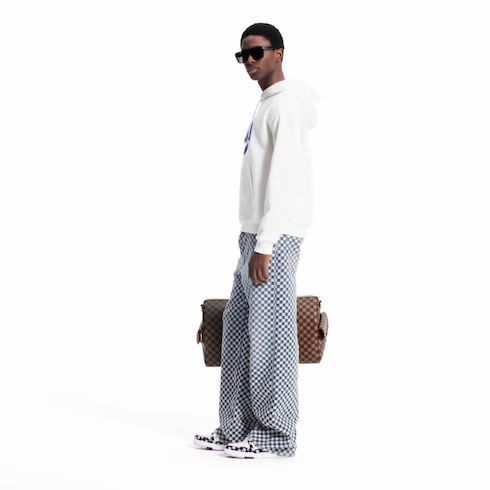 These wide-leg jeans from the Fall-Winter 2025 collection are elevated with an allover Mini Damier pattern. Embroidered in contrasting white thread, the graphic motif brings a softly textured finish to the washed organic denim base. Pearly rivets adorn the pockets, while a nubuck Mini Damier jacqueron signs the back of this summery signature style.