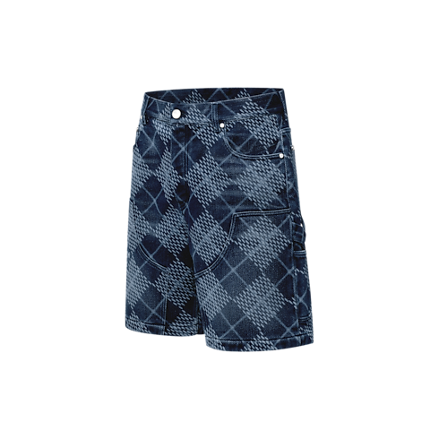 These graphic denim carpenter shorts offer a modern twist on a traditional Argyle pattern, with a bleached-effect allover Damier Argyle design incorporating the iconic House motif. Details include carpenter chaps and hammer holders, while Marque L.Vuitton Deposée signatures complete this on-trend design, which has a matching blouson for a total look.