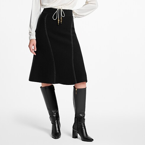 Trompe l’oeil detailing reworks this understated knit skirt with a playful denim effect. It is crafted from a soft, warm wool-cashmere blend in an unfussy flared silhouette trimmed with an elasticized ribbed waistband for a clean finish. Contrasting topstitching and golden rivets introduce a structured look, while a leather Louis Vuitton Paris patch subtly signs the back.
