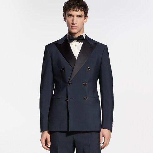 This sharply tailored tuxedo jacket is cut from elegant navy blue grain de poudre wool with a black satin peak lapel. Signature buttons with rhinestone accents in golden metal settings adorn the front, while a woven LV label discreetly signs the back. Matching pants make a poised and timeless evening set.