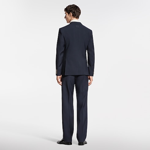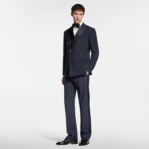 This sharply tailored tuxedo jacket is cut from elegant navy blue grain de poudre wool with a black satin peak lapel. Signature buttons with rhinestone accents in golden metal settings adorn the front, while a woven LV label discreetly signs the back. Matching pants make a poised and timeless evening set.