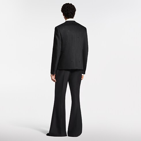 This distinctive black evening jacket draws on the iconic collarless style introduced by Pharrell Williams. The minimalist silhouette, featuring a V-neck opening and piped satin pockets, is adorned with glittering rhinestone pinstripes incorporating Monogram elements. LV cuff links and signature buttons add jewel-like accents. This richly detailed piece brings a sophisticated finishing touch to an evening look.