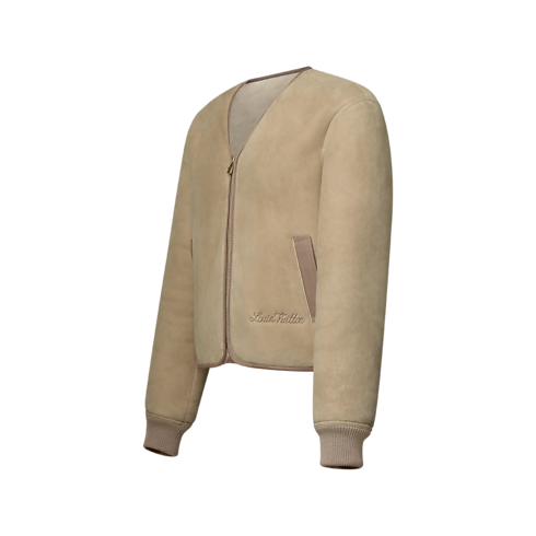 Crafted from velvety suede with a shearling interior, this lightweight liner jacket can be styled alone or under a jacket. Tonal leather adorns the piped edges and pockets, while a cursive embroidered Louis Vuitton signs the front. A printed tonal LV Japan Sketch motif from the Fall-Winter 2025 show adorns the back with additional signature embroidery.