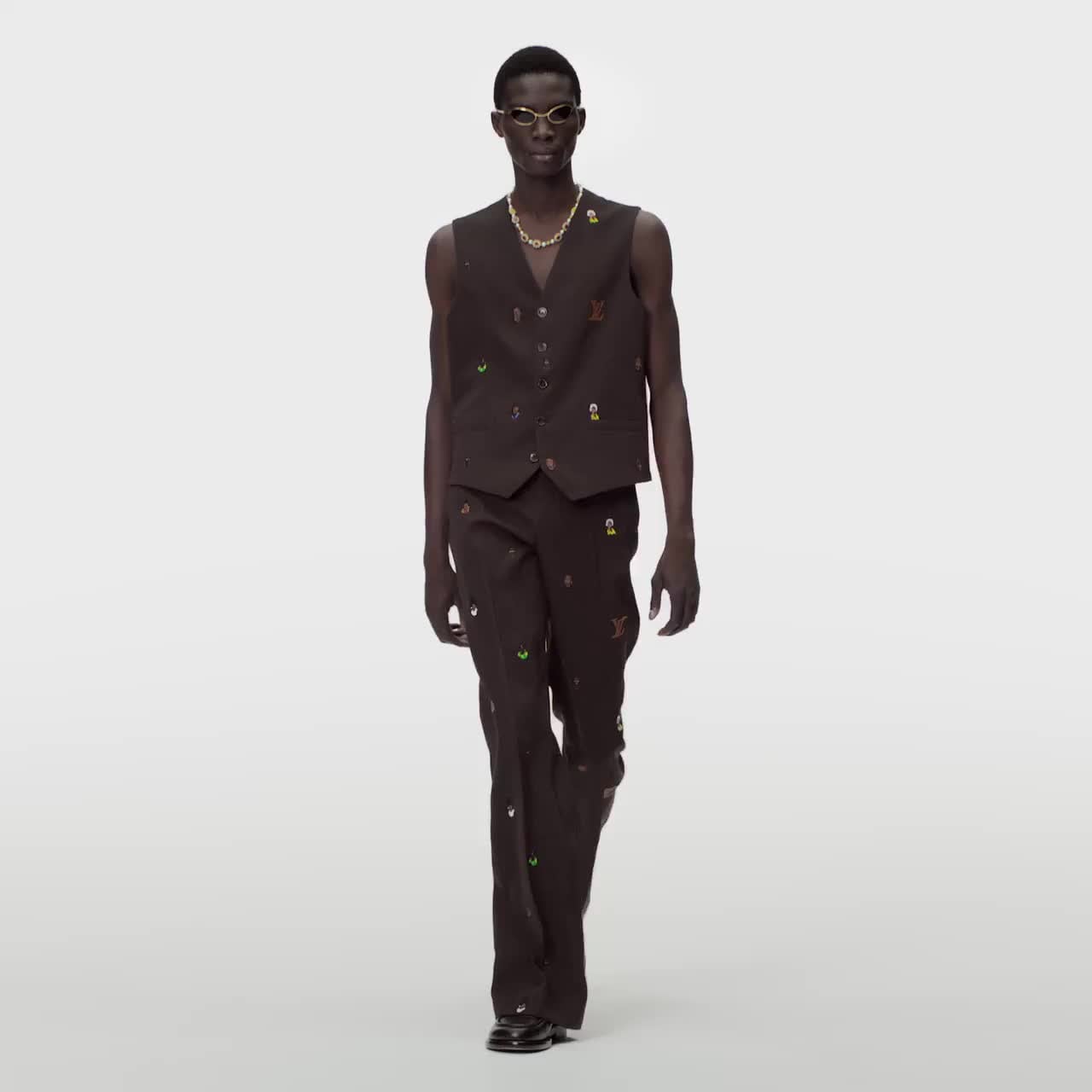 This dark brown tailored waistcoat from the SS24 Show features micro embroideries of painted portraits by the artist Henry Taylor. It is signed with an embroidered LV in contrasting thread. This arty piece completes a suit, but can also be worn on its own, bringing a creative twist to timeless pants or shorts.