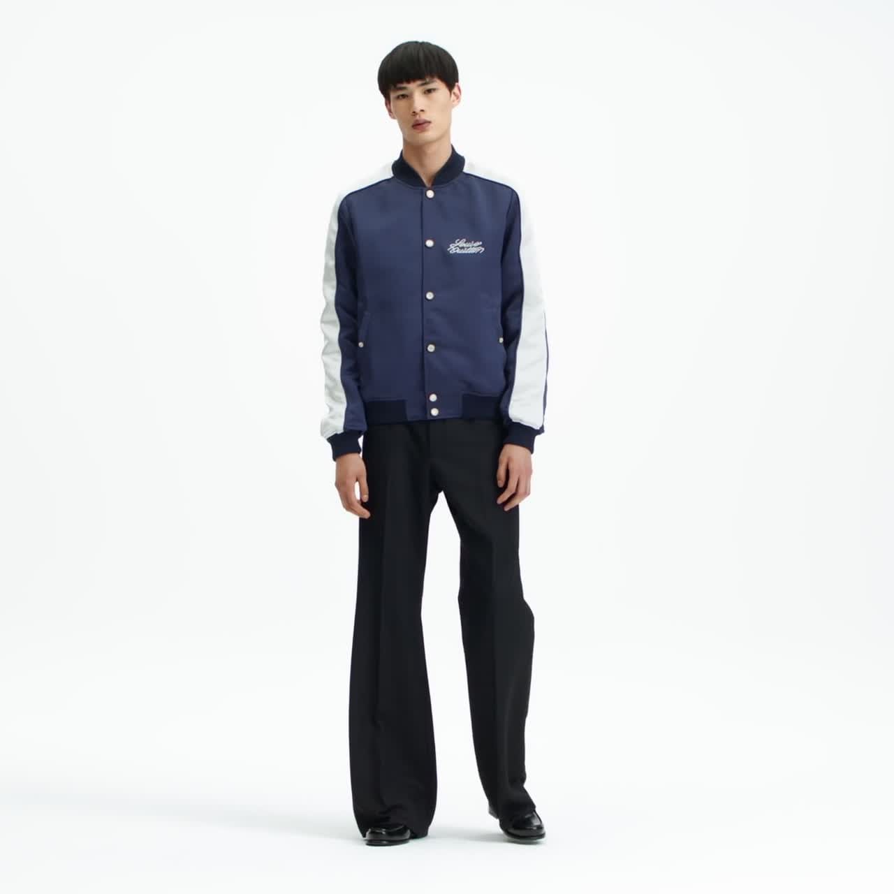 This sleek souvenir jacket is crafted from technical satin in a deep navy blue. A delicately embroidered Louis Vuitton signs the chest, while the back is adorned with a Monogram Horses Tapestry motif, with a printed Monogram overlaid with a richly embroidered scene. Crisp white bands on the sleeves and pearly snap buttons complete this casual yet sophisticated piece.