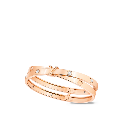 The iconic Empreinte jewelry collection is an ode to travel and adventure inspired by the House’s luggage-making heritage. Expertly crafted in 18-karat pink gold and set with diamonds, this elegant genderless double bangle showcases the famous LV signature in a design recalling the nails that adorned the original Louis Vuitton trunks. With its graphic contemporary style, this eye-catching jewel is easy to stack, mix or match with other creations from the collection.