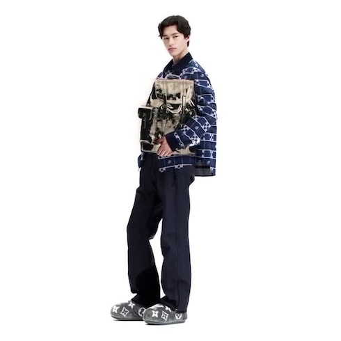 This soft cotton flannel shirt is perfect for relaxed evenings by a roaring fire. It is adorned with a jacquard plaid in navy blue tones incorporating Damier elements. The collar and cuffs stand out in corduroy, while a VVN-colored leather signature patch and LV embroidery on the collar add smart finishing touches. This graphic piece can also be styled as an overshirt.