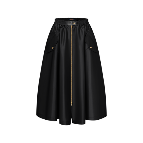 Functional details refresh this chic mid-length skirt with a modern sporty feel. It is cut in a fluid flared shape from lustrous nylon, complete with a comfortable elasticized waistband trimmed with a leather snap-button tab. A double-ended zipper allows for versatile styling, while multiple pockets complete the look with a practical touch.
