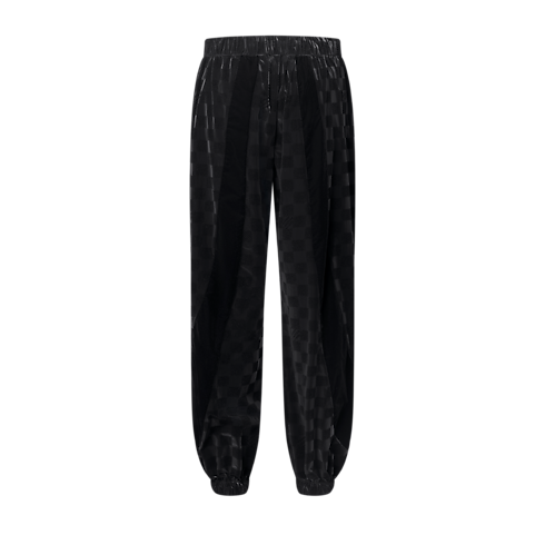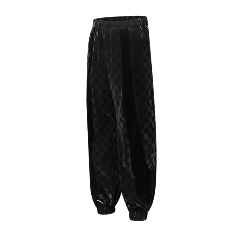 These black track pants from the Spring-Summer 2025 show offer a chic twist on a sportswear classic. The lustrous technical fabric is adorned with a flocked matte Damier motif incorporating Marque L.Vuitton Déposée signatures, while sweeping velvety bands add to the play of textures. Both comfortable and refined, these pants make a sleek travel set paired with a matching top.