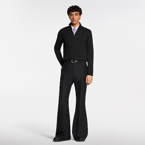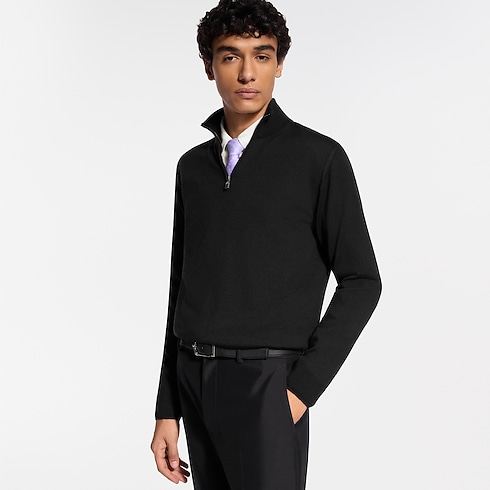 This chic black half-zip sweater is crafted from a luxurious blend of wool, silk and cashmere, offering a soft touch for optimum comfort. The fine, summery knit features signature embroidery on the left hem and a leather LV patch on the back. This timeless piece can be worn open over a shirt or zippered like a turtleneck.