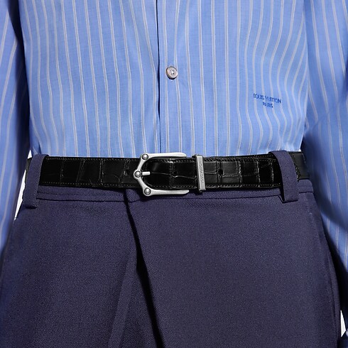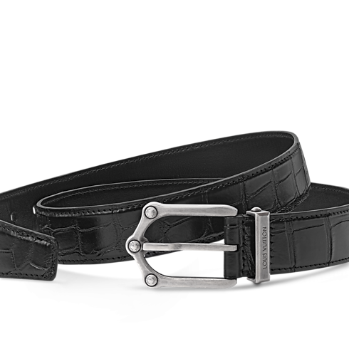 The Frog 30mm Reversible Belt in Crocodile is an elegant and evocative piece. The textured crocodile leather heightens the dimensional quality of the ornamental buckle and is dotted with palladium-toned embellishments engraved with the Initials. For an equally sophisticated approach, the smooth, solid reverse offers a simpler style.