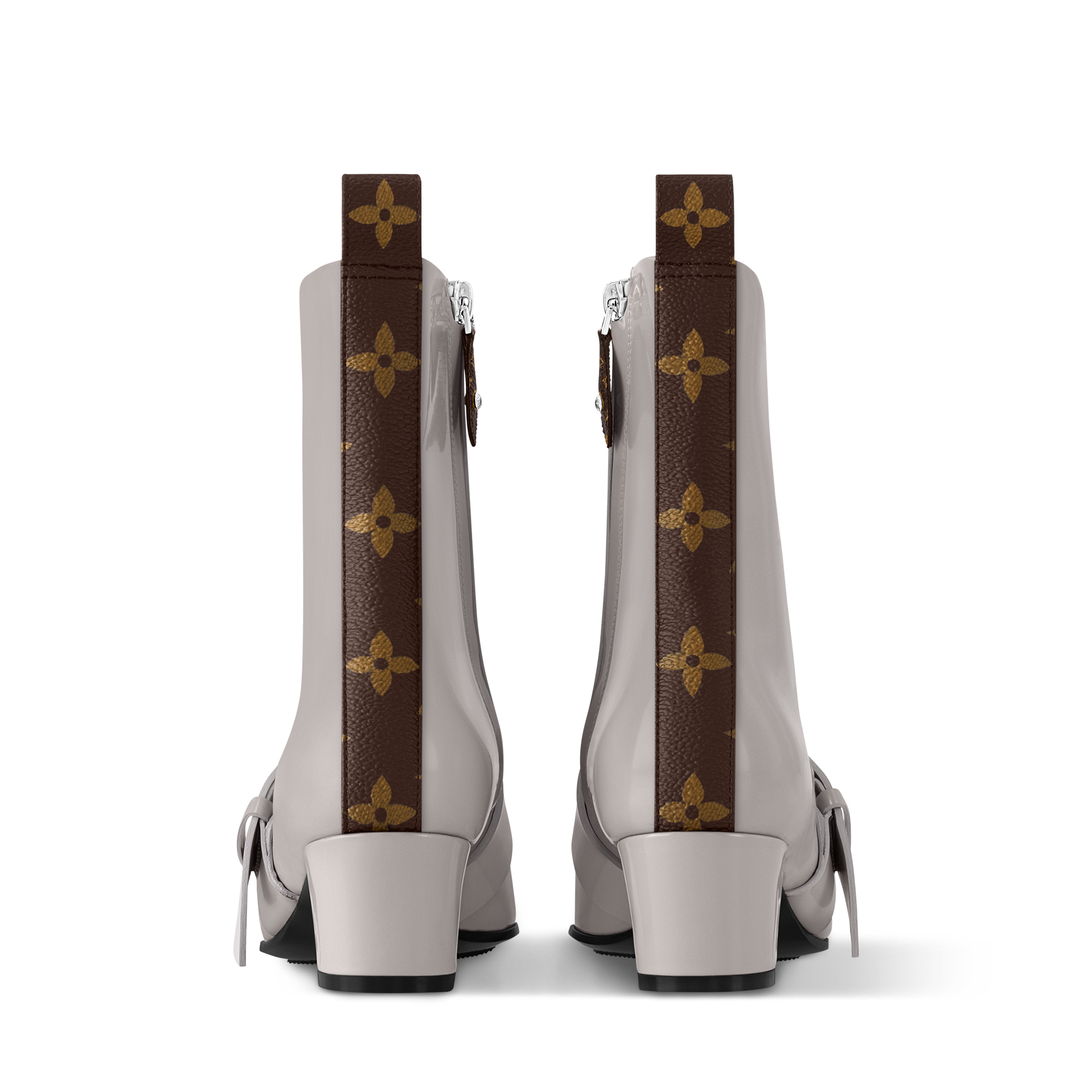The Fusée ankle boot in glazed calf leather was the statement shoe of the Cruise 2025 show. Inspired by the Sixties, it has a streamlined design with a pointed toe, which is complemented by a decorative strap and a square buckle stamped with the Louis Vuitton signature. This model is finished with a low, angled heel and a back loop in Monogram canvas.