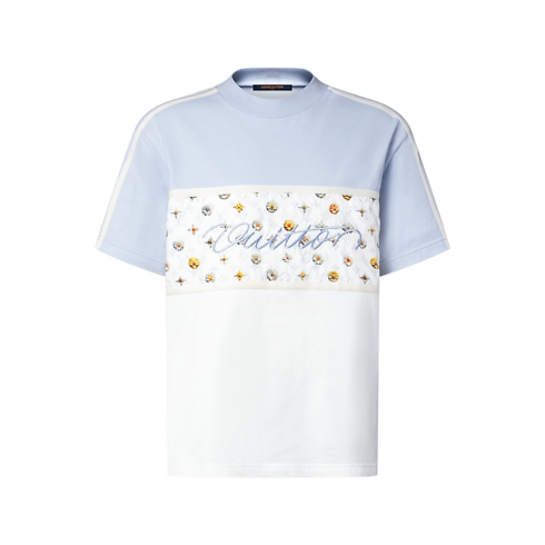 Playful spring florals adorn this color-blocked pale blue and white organic cotton T-shirt. A Blooming Monogram motif adorns sporty inserts across the chest and on the sleeves, while an embroidered cursive Vuitton signature in lustrous yarn signs the front. Easy to style with this collection’s pastel tones, this T-shirt lends a graphic accent to casual looks.
