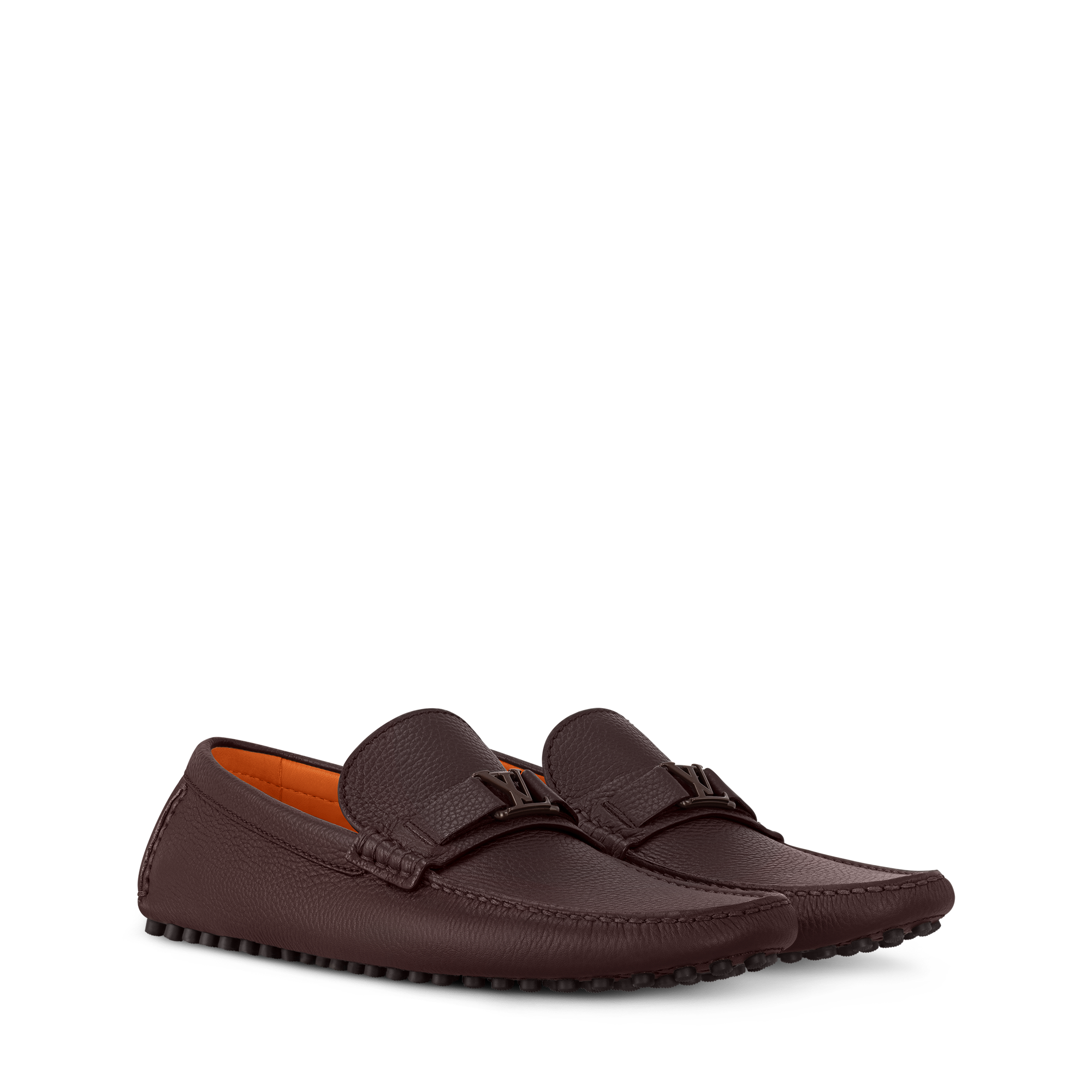 This refined interpretation of the Hockenheim mocassin comes in grained calf leather with a contrasting lining that adds a pop of color. This classic car shoe is notable for its hand-stitched vamp, which is signed with an LV Initials accessory. It has an extremely supple, lightweight outsole made of small rubber nubs.