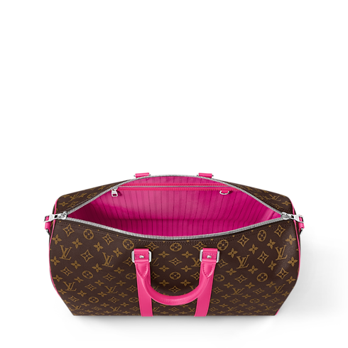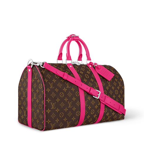 The Keepall Bandoulière 45 bag is made from Monogram Macassar coated canvas with colorful leather trim, as part of the second chapter of the LV Colormania collection. The touches of color on the leather side bands, top handles, removable name tag, and detachable shoulder strap bring sophistication to this classic travel bag.