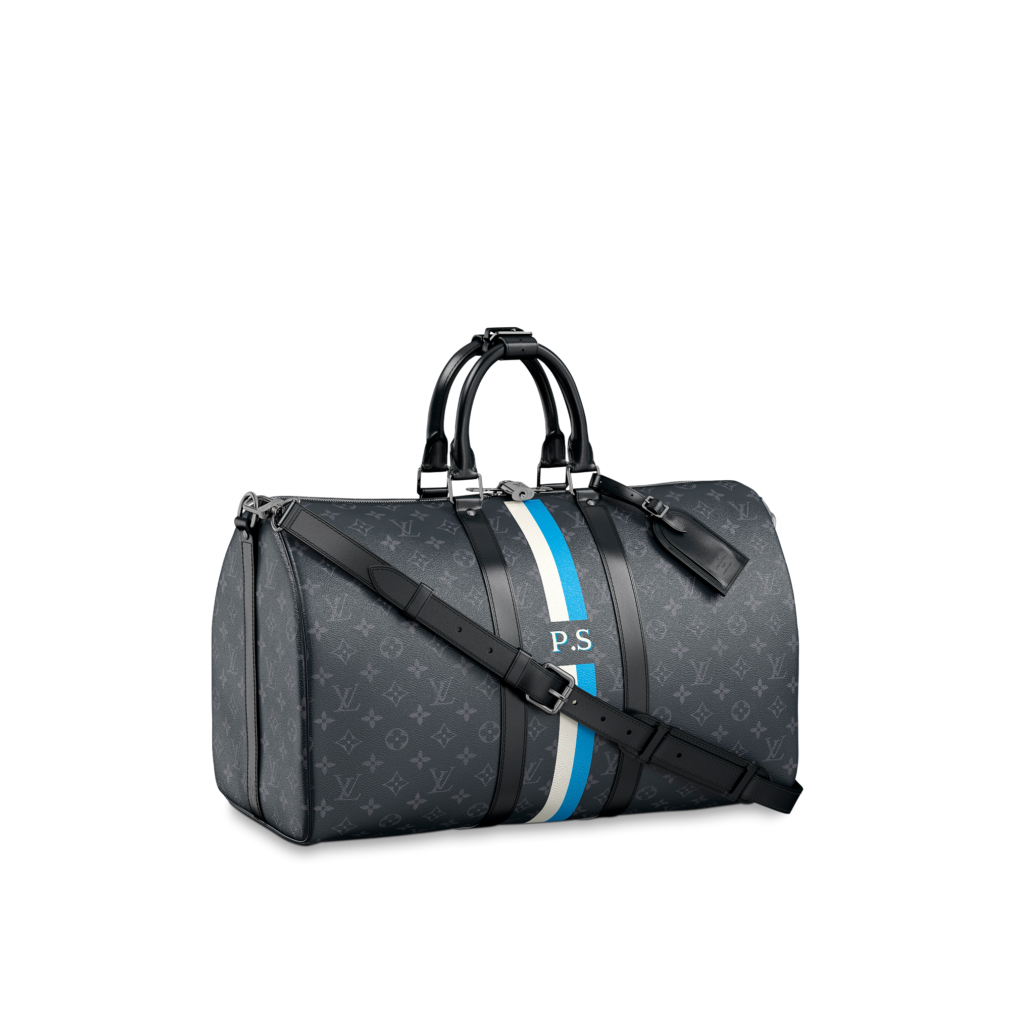 This iconic Keepall 45 Bandoulière is fashioned in our new iconic black and grey Monogram Eclipse canvas. Since 1930, the Keepall duffle has journeyed alongside generations of elegant globetrotters. This version – with comfortable-to-hold leather handles, a strap for casual cross-body wear and a gleaming padlock – holds all the essentials for an overnight jaunt.