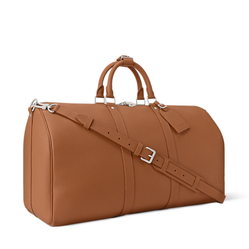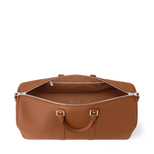 A perfect weekend companion, the iconic Keepall Bandoulière 50 is crafted from waxy calf leather with matching-colored textile lining and aged silver brass hardware. Supple fine-grained leather and a discreet LV Initials signature on the front lend understated elegance. Two top handles and a removable, adjustable strap offer versatile carry options.