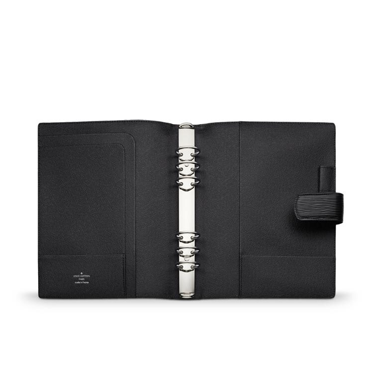 - Six-ring binder, separated into two groups of three, credit card slots, several compartments