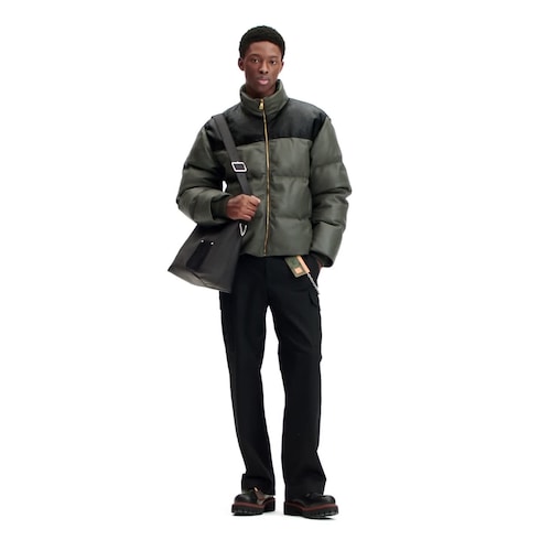 This luxurious down jacket is crafted from ultra-supple Napa leather with a warm and light Ecodown© filling. The smooth dark gray body and sleeves contrast with a black grained leather yoke elevated with a debossed Monogram motif. A stand collar and knitted ribbed cuffs keep the neck and wrists warm, while a hidden drawstring waist adds further protection from the cold.