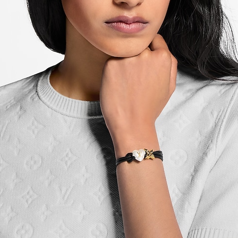 Inspired by the House’s iconic emblems, the LV Bloom Pearl Heart bracelet is an exquisite expression of affection. On a double leather cord, a Monogram Flower in gleaming gold-toned metal is paired with a heart-shaped resin pearl delicately engraved with the LV Initials. A refined, easy-to-wear bracelet with an enchanting romantic aura.