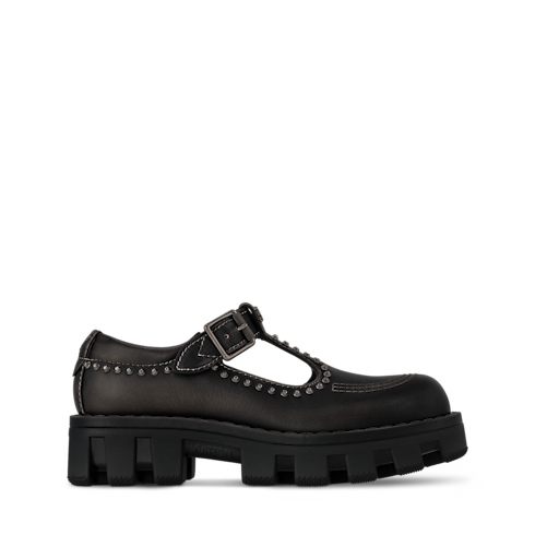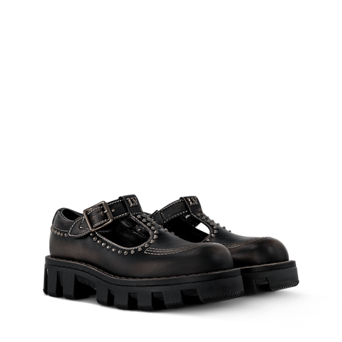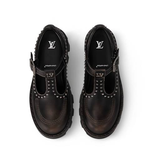 The LV Checker Mary Jane is revisited this season in smooth calf leather with a vintage look. The upper is complemented by contrast stitching, a silver-toned buckle and studs, and the LV Initials signature on the tongue. This model has a chunky yet lightweight rubber outsole, which was inspired by workwear and features a Damier-pattern tread.