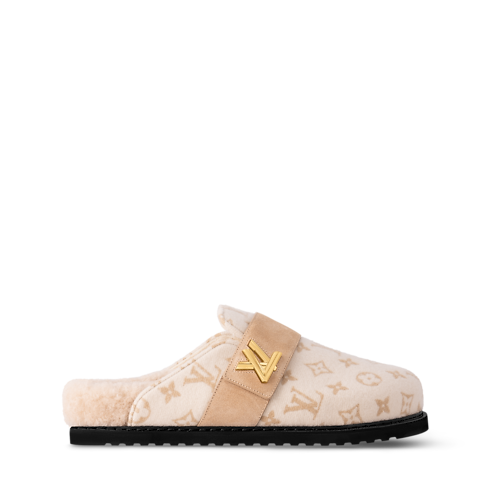 The LV Cosy flat comfort clog lives up to its name in soft Monogram cashgora wool, a material taken from the Women's Ready-to-Wear collection. A shearling-covered insole further enhances this casual-chic style, which comes on a lightweight micro outsole. On the upper, the adjustable strap in suede calf leather is signed with an LV Twist accessory.