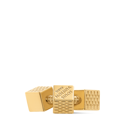 The angular forms of Pateki, a puzzle game devised by Gaston Vuitton in 1932, are brought to life in the playfully elegant LV Cube ring. Three gold-colored metal cubes are delicately engraved with stripes recalling the look of the iconic Damier canvas. The Louis Vuitton Paris signature adds a finishing House touch to this finely crafted, enchanting ring.