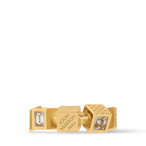The eye-catching angular forms of the LV Cube ring were inspired by Pateki, a puzzle game invented by Gaston Vuitton in 1932. Its gold-colored metal band holds an array of cubes reminiscent of the historic Damier canvas, engraved with delicate stripes and the Louis Vuitton Paris signature. Resplendent rhinestones add a glamorous touch of sparkle to this enchanting ring.