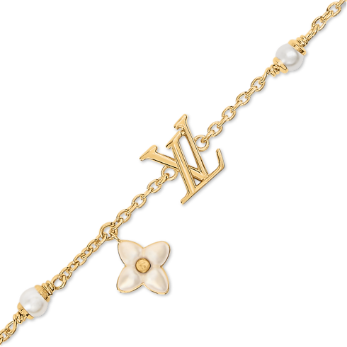 The heritage-inspired design of the LV Floragram XS bracelet pays homage to the beauty and symbolism of the pearl. Meticulously crafted in gold-colored metal, it features a graceful LV Initials charm and a Monogram Flower enhanced with pearlescent white resin. Four lustrous resin pearls add an extra touch of feminine elegance to this subtly glamorous bracelet.