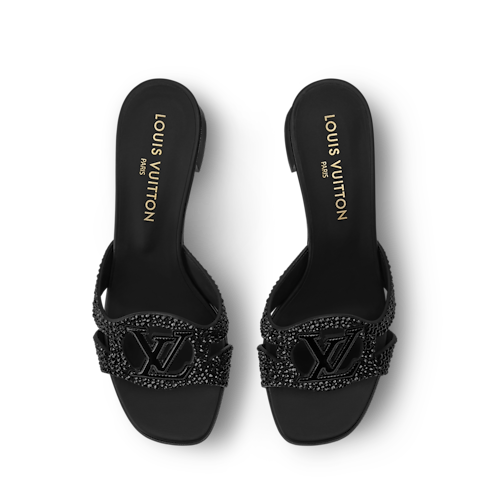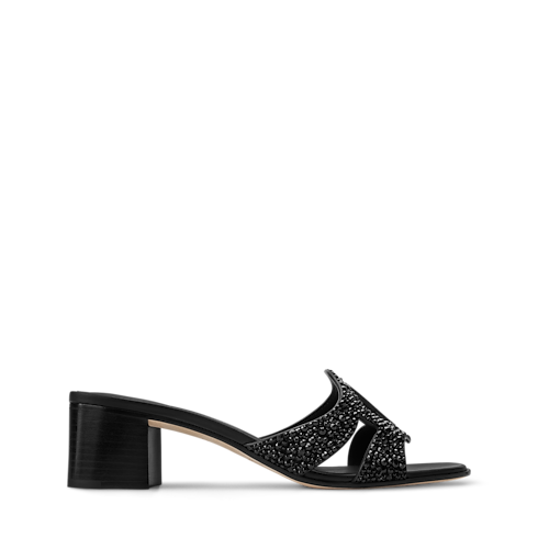 The LV Isola mule is reimagined this season in a glamorous version covered with glittering rhinestones of different sizes. They surround the central LV Circle motif, cut out of the leather, which is the signature of the LV Isola line. This timelessly elegant style is finished with a low block heel.