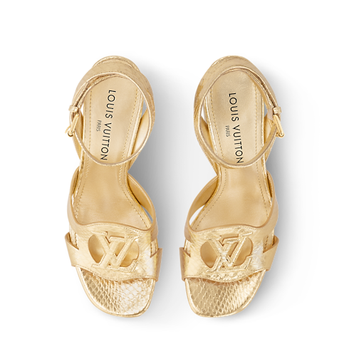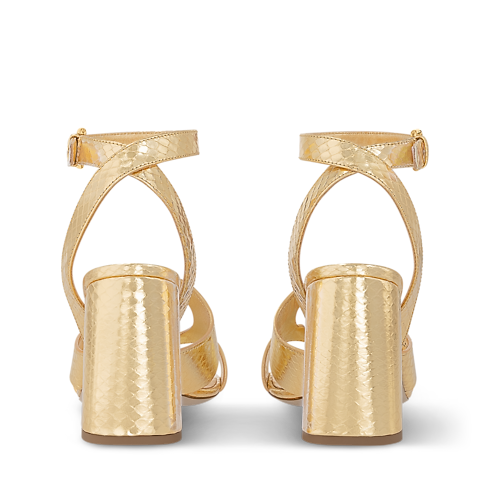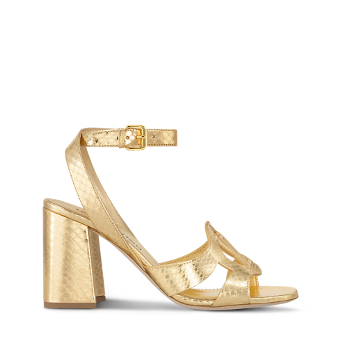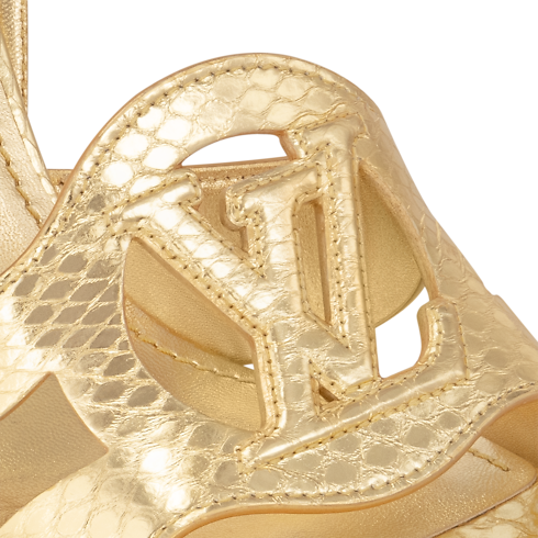 This striking interpretation of the LV Isola sandal is crafted from metallic water-snake leather, which also covers its high block heel. An icon of the Louis Vuitton shoe collection, the LV Isola line is distinguished by its oversized LV Circle signature. This sandal is fastened around the ankle by a slender strap with a small, square buckle.