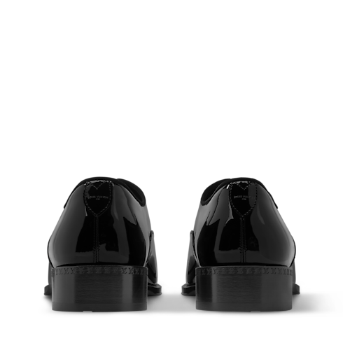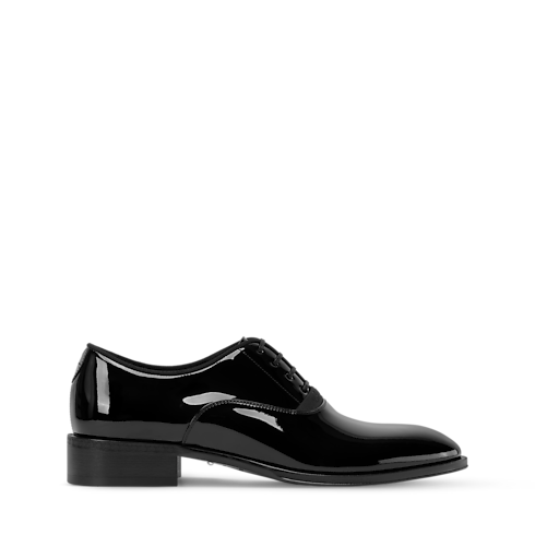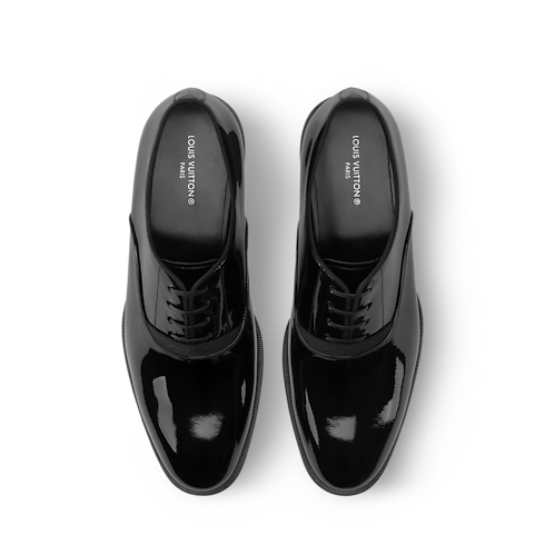 The LV Premiere Oxford lace-up in patent calf leather evokes the refined spirit of English gentlemen, revisited by Men's Creative Director Pharrell Williams. Its sleek lines are complemented by elevated details, including an embroidered signature on the laces. This model is finished with a slightly higher than usual heel and a leather outsole decorated with Pharrell Williams' signature pearl.