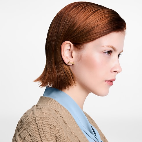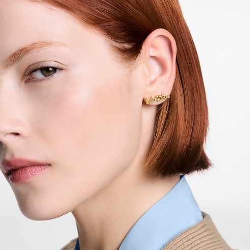 The eye-catching LV Script stud earrings feature an original House signature spotlighted in the Spring-Summer 2025 runway show. Delicately crafted in radiant gold-toned metal, their finely detailed design spells out Louis Vuitton in a sleek, fluid script style. Whether for everyday or formal occasions, these distinctive earrings bring a touch of fantasy to any look.