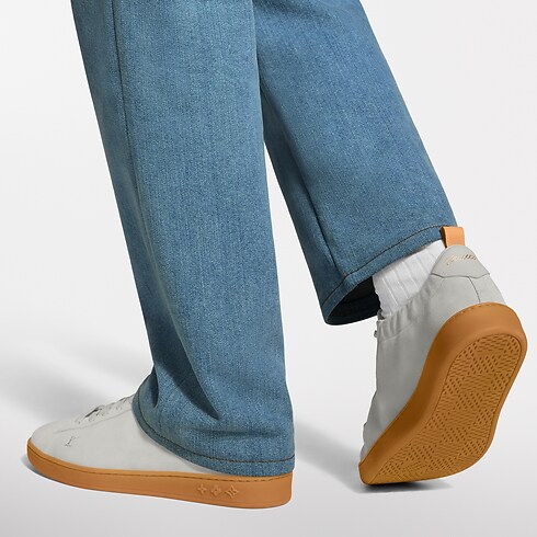 The LV Soft sneaker comes in supple suede calfskin with trim in the House's emblematic natural leather. In addition to laces, it features an elasticized heel for an easy, slip-on fit, and a sacchetto construction for lightness and comfort. It bears the LV Initials on the side and a Pharrell Williams-designed Vuitton signature at the back.